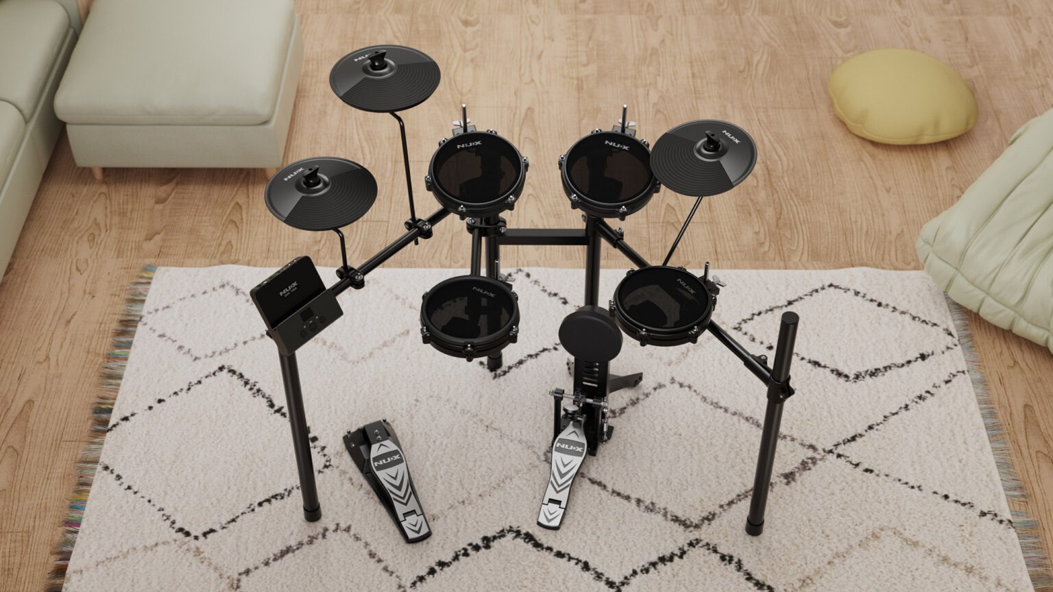 Cuenta con un elegante marco de metal y pads de batería y platillos compactos, brindando una funcionalidad y un rendimiento excepcionales sin concesiones.