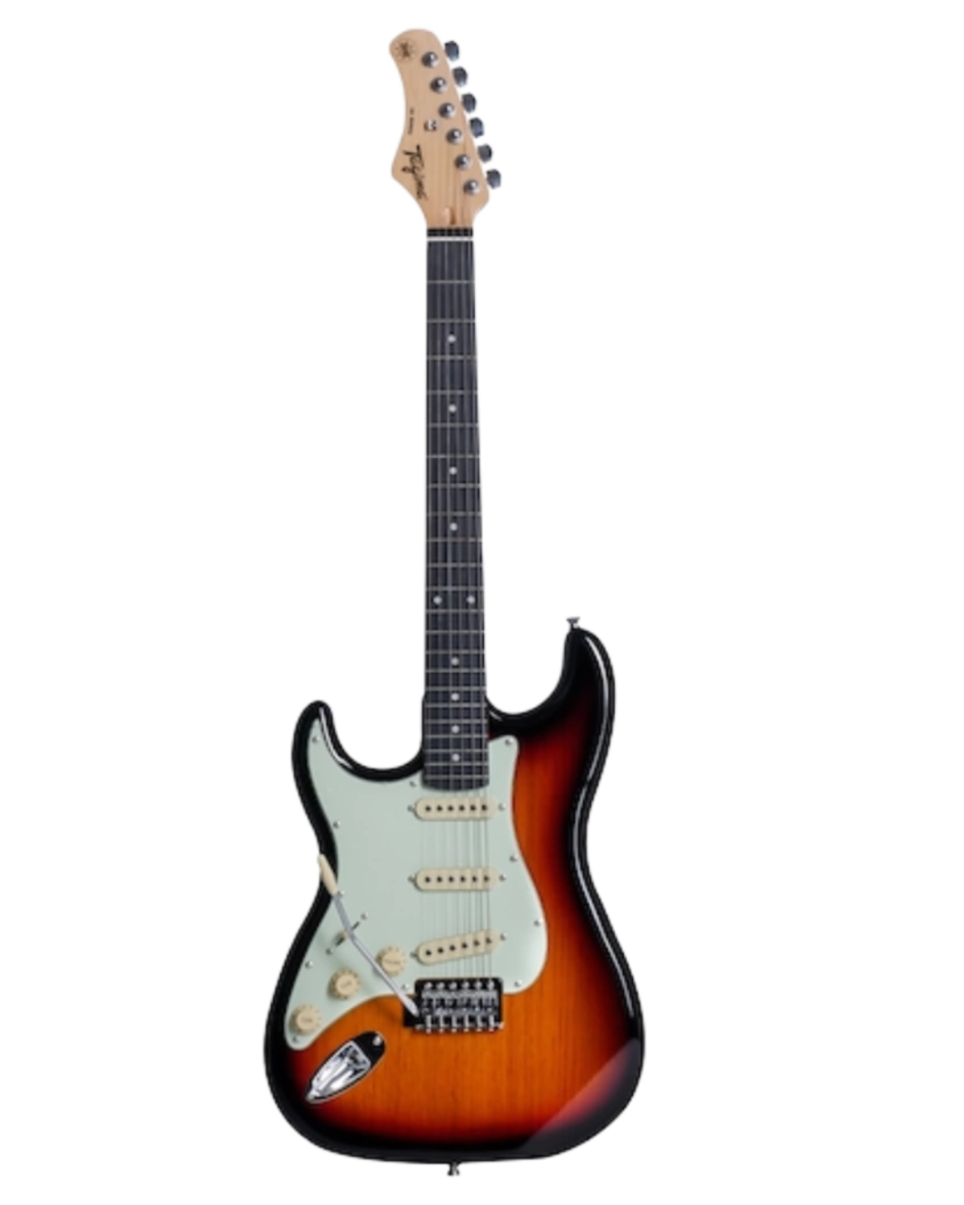 Guitarra electrica para zurdos TG-500 LH SB D MG color sunburst, cuerpo en basswood, brazo en arce, diapason en technical wood (oscuro) 22 trastes, pickguard Mint Green, 3 Pick Ups single coils Tagima, selector de 5 posiciones, 1 control de volumen, 2 controles de tono.